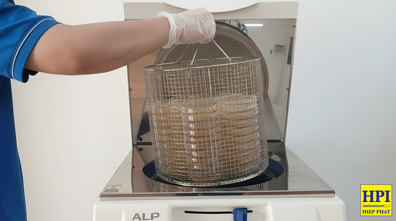 Bước 4: Đặt giỏ chứa đĩa petri đã qua sử dụng vào trong nồi hấp