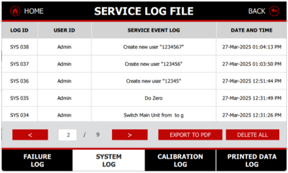 Tính năng System Log cho phép ghi lại 100,000 thông tin vận hành của cân như System Log, Calibration Log, Printed Data Log và Failure log