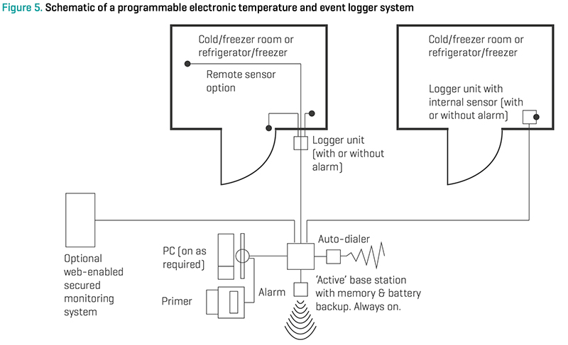 Theo tài liệu “How to Monitor Temperatures in the Vaccine Supply Chain” thuộc Vaccine Management Handbook của WHO, hình 5 minh họa sơ đồ của một hệ thống ghi nhận nhiệt độ, bao gồm trạm cơ sở hoạt động liên tục với bộ nhớ và pin dự phòng, kết nối với các đơn vị logger có cảm biến bên trong hoặc bên ngoài, đặt tại các khu vực lưu trữ lạnh như phòng lạnh hoặc tủ đông. Hệ thống này hỗ trợ kết nối với PC cho giám sát web an toàn, auto-dialer để gửi cảnh báo qua email/SMS, và báo động cục bộ bằng loa hoặc đèn khi nhiệt độ vượt giới hạn. Các cảm biến được đặt tại điểm nóng/lạnh cực đại, đảm bảo giám sát đa kênh và từ xa, tương tự như nguyên tắc hoạt động của DeepWave.